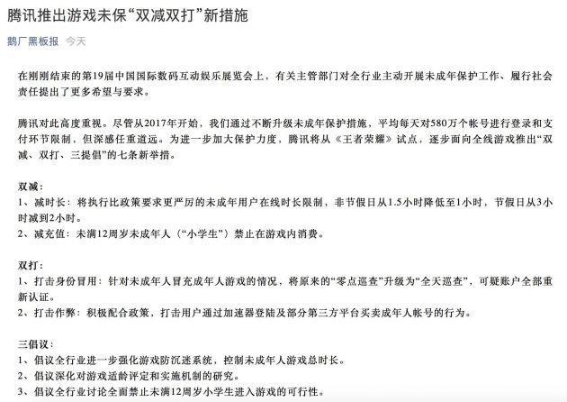 前一天(8月3日),腾讯就表示将从《王者荣耀》试点,逐步面向全线游戏推出“双减、双打、三提倡”的七条新举措。