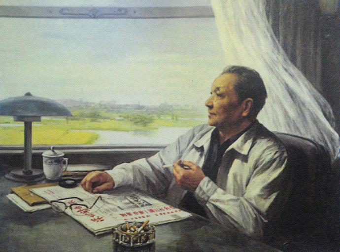 油画《南巡途中》就是表现邓小平视察途中在火车上思考的情景。画家张祖英没有按照常规,选择大规模群众场面和多人组合的构图,而以肖像画的艺术形式,重点刻画邓小平本人丰富的内心世界和个人风采。画面中小平左手拿烟,右手微握, 泰然自若地坐在南巡列车内,双目透过车窗深情远眺着窗外。窗外飞驰而过的南方大地一片生机,春意盎然,预示着邓小平改革开放的雄才伟略正如“春风”已经吹绿了东方神州。画面上人物眉宇间凝神思考的神态,左手边装满烟头的烟灰缸,桌上摆放的《深圳特区报》和老花眼镜,都在显现出一代伟人不顾年迈,仍在对祖国前途命运的关注和思考。整个画面的处理简洁、硬朗、明亮,黑白层次对比强烈,提高了画面的精神维度,突出了人物的形象和精神状态,运用写实主义的手法刻画了一位品德崇高、胸怀博大、胆识卓越的世纪伟人的形象。
