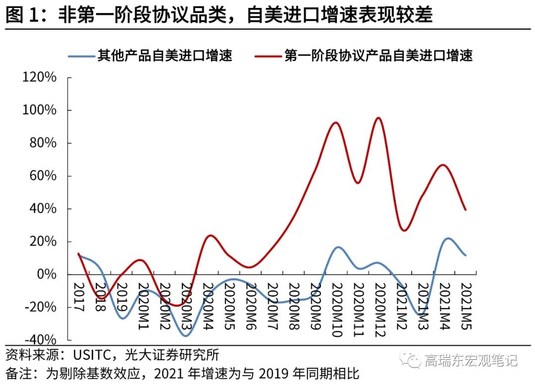 关税对美国国内输入通胀,限制美国经济复苏,中美均有意愿减免关税。我们在4月14日的报告《气候先行,关税殿后,中美经贸缓和路线图》及6月8日的报告《“政冷经热”怎么谈,美方诉求在哪里?》中均提到,中美均有意愿减免关税。对于美方来说,一则,关税持续对美国输入通胀,限制美联储的货币政策操作空间。二则,由于中国目前也对美方征收反制关税,因此,非第一阶段协议产品,今年以来中国自美进口增速表现较差,同样限制了美国经济的复苏。对于中方而言,出口或在今年四季度承压,减免关税对于稳定出口有重要意义。