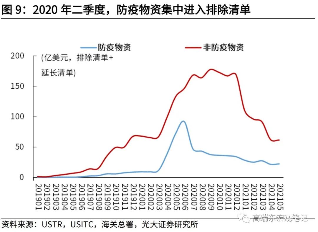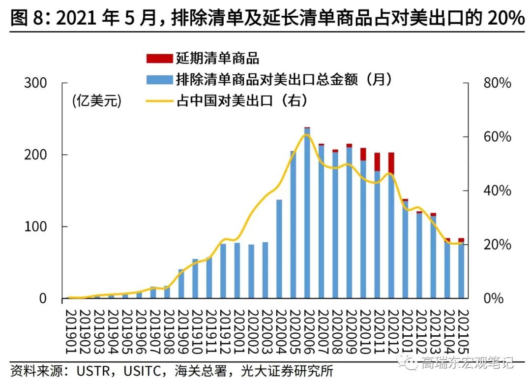 2020年三季度,及2021年二季度,关税“排除清单”集中到期;2021年四季度,剩余的“延长清单”也会陆续到期。2019年三季度和2020年二季度,美方密集公布了几批关税排除清单。2019年三季度,中美关系峰回路转,美方在9月前后集中公布了一批关税排除商品,释放诚意;2020年二季度,在新冠疫情的冲击下,美方针对防疫物资集中公布了一批关税排除商品。这使得关税排除清单,在2020年三季度,和2021年二季度,集中到期。2021年三季度,仅有少部分关税延期商品清单在生效。截至2021年5月,关税排除清单中的商品,加上关税排除清单到期后又延期的商品,占到中国对美出口金额的20%,远低于峰值的60%[1]。