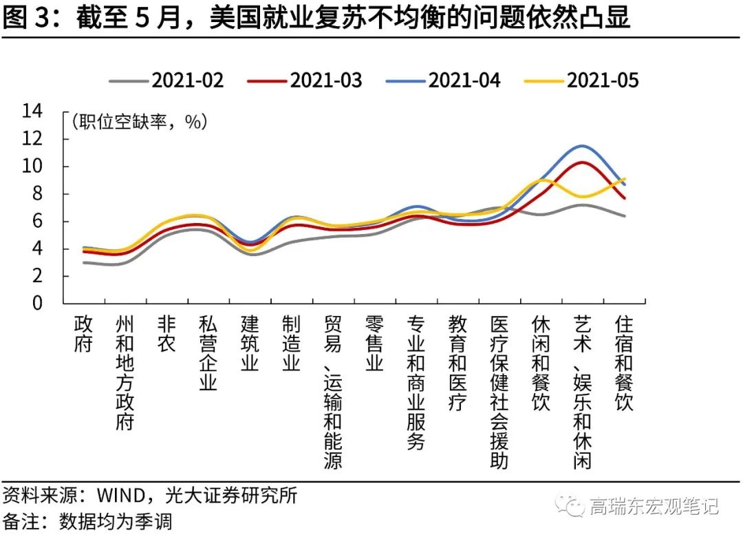 中美经贸关系缓和,也需要合适的窗口期,至少要等到美国国内就业基本恢复。美国经济依然处于复苏进程之中,就业恢复尚不充分。在美国就业基本恢复之前,拜登减免对华关税,都容易招致美国国内舆论反弹。一方面,美国目前就业总人数尚未回到疫情之前,就业复苏不均衡,密切接触型行业的职位空缺率远高于建筑、制造业。另一方面,6月开始多个州陆续取消失业补贴,9月初全美才会结束失业补贴发放。叠加疫情后,居民获得了多轮现金直接补贴,部分居民重返劳动力市场的进程可能相当缓慢。截至6月末,全美就业总人数尚未回到疫情之前水平。