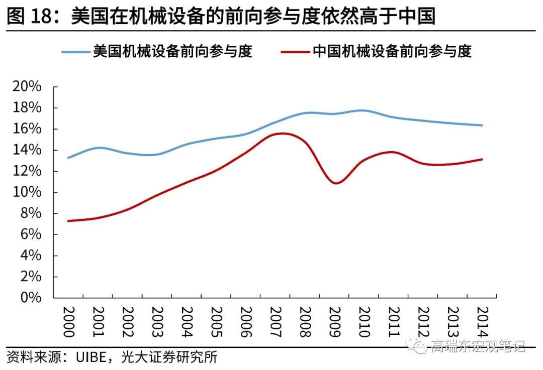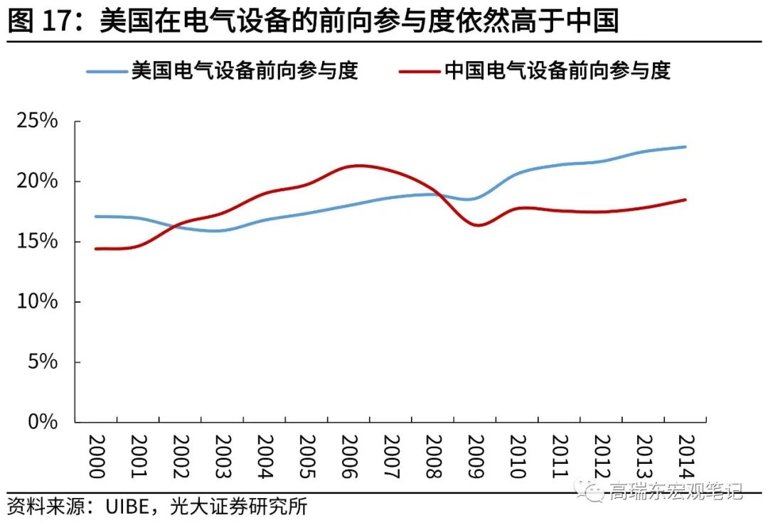 当然,后向依赖度高,并不代表美国在产业链的研发、设计方面不占优势。实际上,在电气设备和机械设备方面,美国的前向参与度也处于较高水平。前向参与度较高,则表明该国的国内增加值更多的是作为中间产品出口到了第三国家,即在国际生产链上的位置就越靠前。