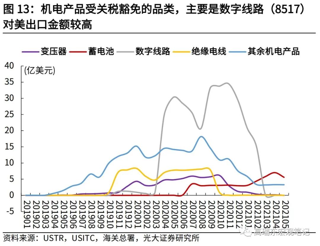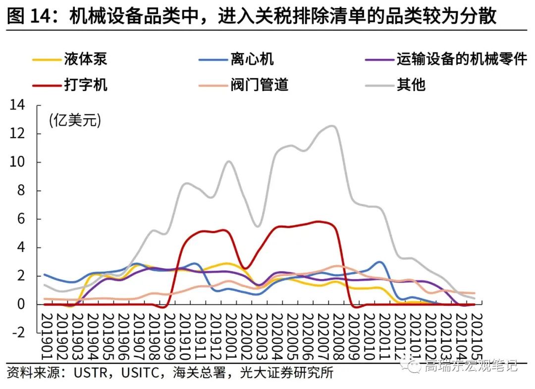 具体而言,哪些机电产品和机械设备进入关税排除清单?针对机电产品(85章)和机械设备(航空仪器、机械器具、钟表等)进一步分类,我们发现,机电产品进入受关税排除清单的品类,主要是数字线路(8517[2])。机械设备方面,进入受关税排除清单的品类较为分散,主要是航空器(8803[3])、液体泵(8413)、离心机(8421)、运输设备的机械零件(8431)、打字机(8473)、阀门管道(8481)。在疫情期间,打字机这类与宅经济办公相关性较大的品类也大幅进入了豁免清单。