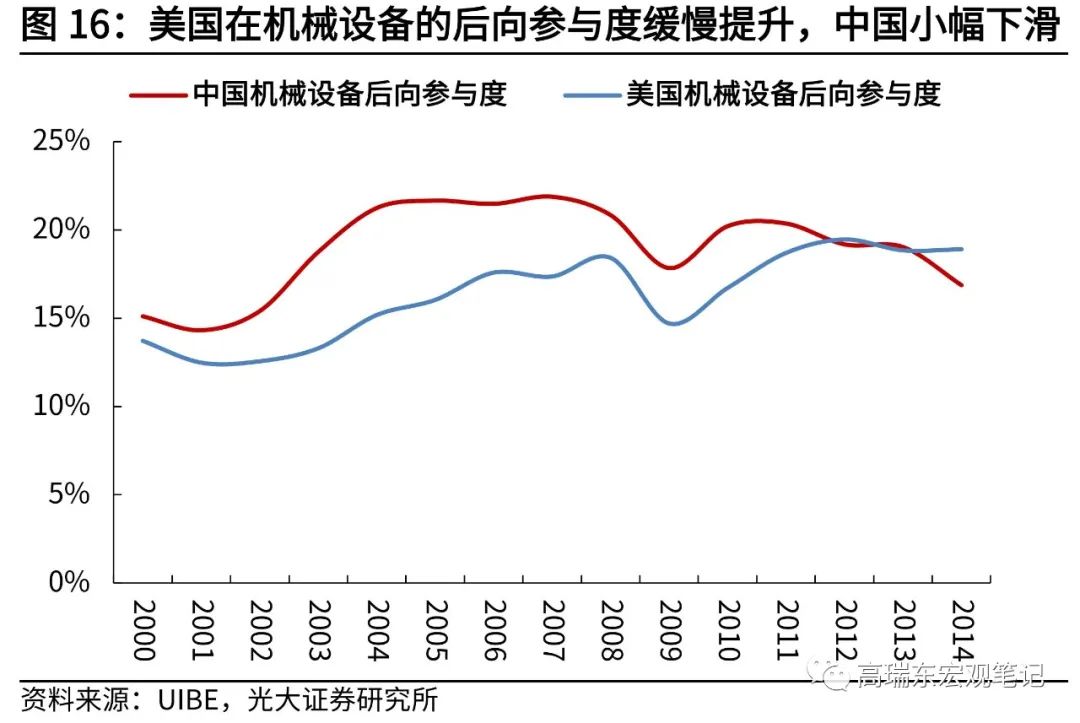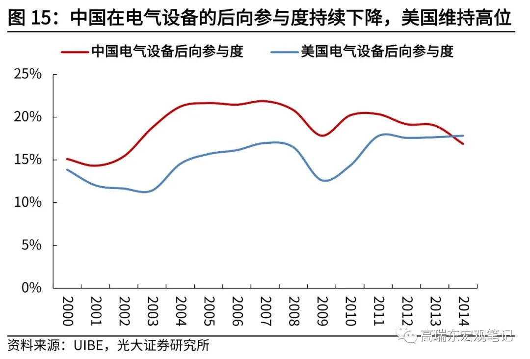 美国在电气设备、机械设备领域,一方面占据了行业最上游的研发、设计等核心环节,另一方面,对中间品的进口依赖度也比较高。根据WIOD数据库计算出来的前向和后向参与度可以看出,美国在机械设备、电气设备方面的参与度,自次贷危机后持续上升,而中国则在持续下降。在全球贸易价值链的核算中,后向参与度越高,表明该国的供应链对外国的中间产品依赖程度较高,即在产业链处于下游位置,对中间产品依赖程度较高。