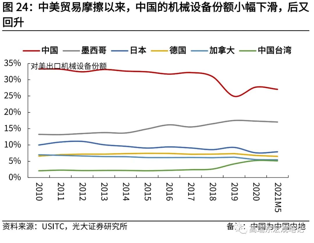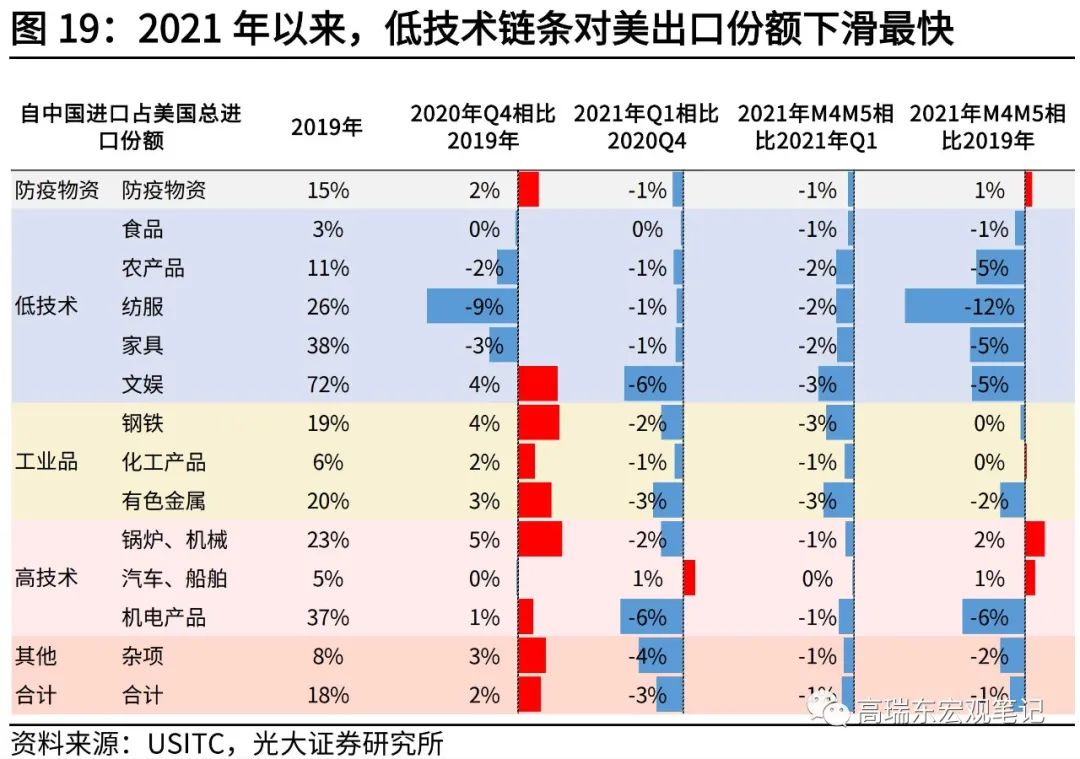 低技术品类份额下滑最大,机电产品、机械设备的份额下滑则相对较小。2021年5月,相对2019年,低技术链条中的食品、农产品、纺服、家具等品类,在美国总进口的份额普遍下滑了5个百分点以上,纺服大幅下滑了12个百分点。但是,工业品链条和高技术品类,如机电设备、汽车船舶、机械设备等品类的份额则相对稳定,机械设备的份额依然高于2019年。从份额来看,说明美方对于中国机电设备、机械设备的依赖度较大。