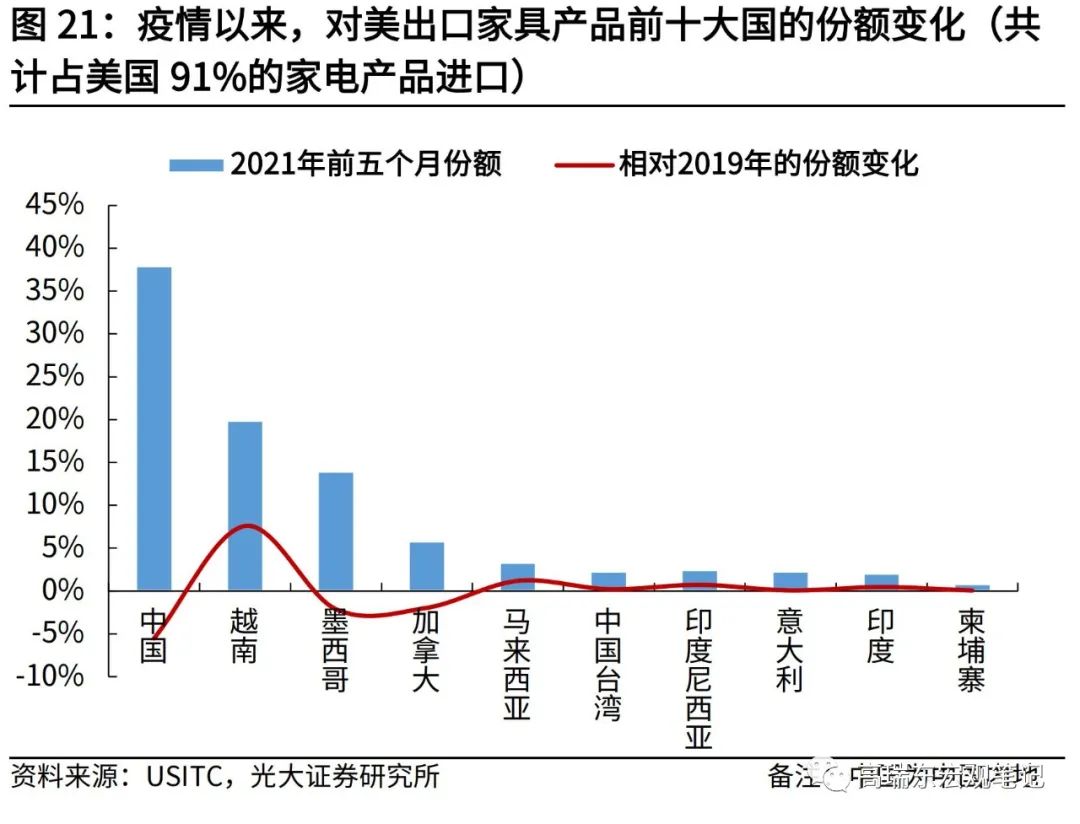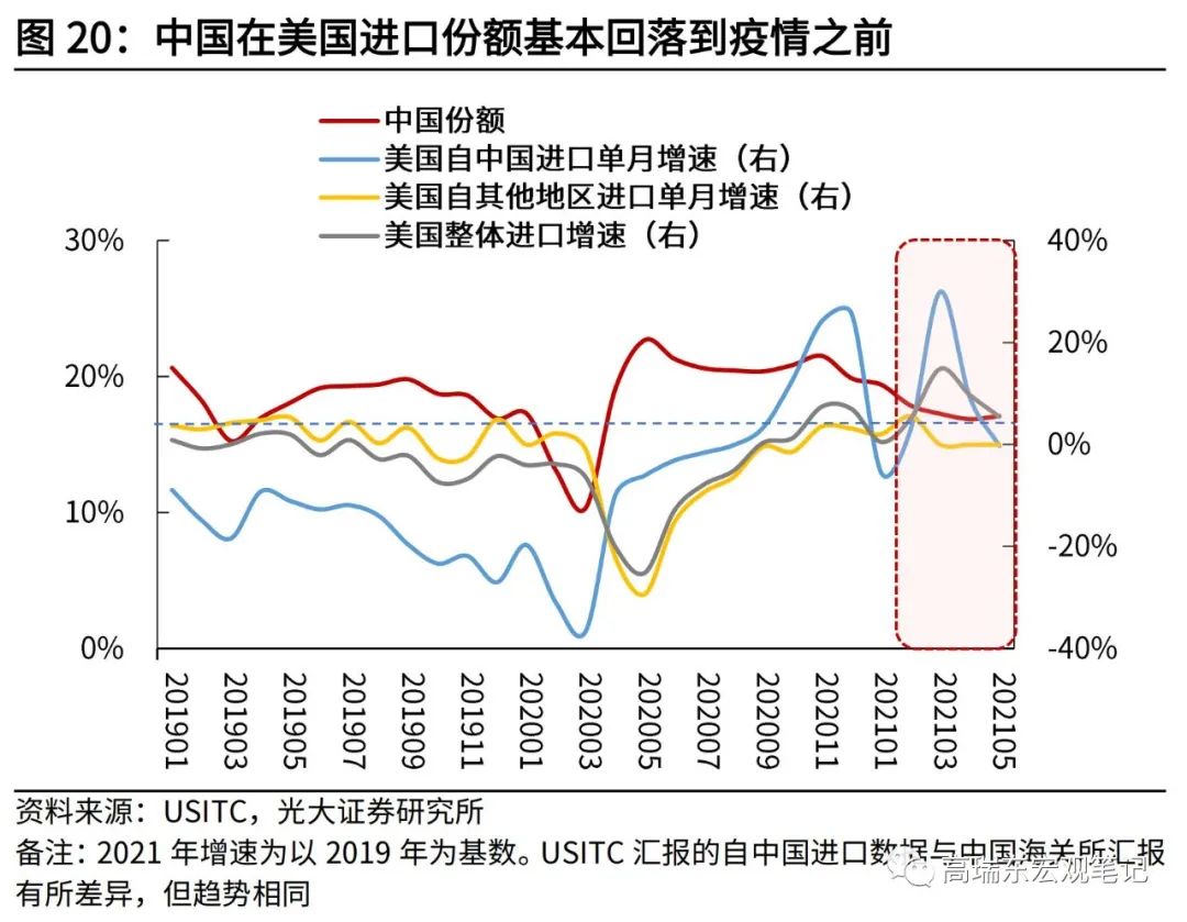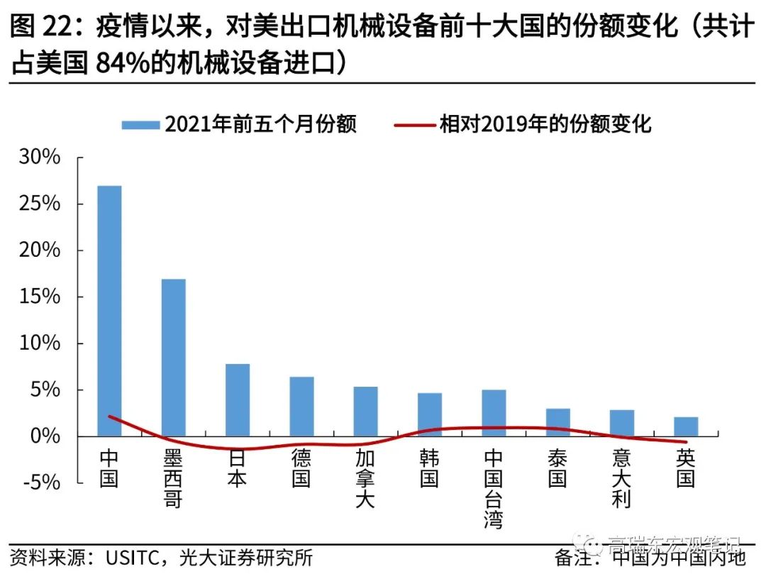 我们通过观察疫情以来,中国各类产品在美国进口所占份额,来观测美国对于相关品类进口的依赖度,以进一步佐证我们的观点。2020年上半年,据美方公布数据(USITC),自中国进口在美国总进口的份额约为18%。2020年上半年,疫情冲击下,中国和欧洲的份额快速上升,主要替代了墨西哥,和日韩的份额。2020年四季度以来,随着全球经济重启,中国份额快速下降。截至2021年5月,中国份额基本回到疫情之前。