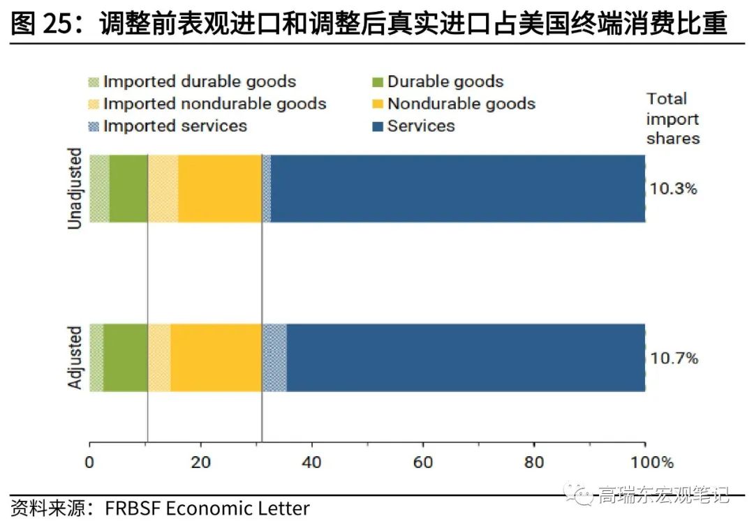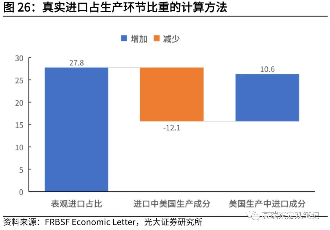 具体来看,在终端消费中,表观进口为10.3%,进口中美国成分为4.4%,美国生产中进口成分为4.7%,因此,真实进口占终端消费的比重为10.7%(即为10.3%-4.4%+4.7%)。进一步,在生产环节中,表观进口为27.8%,进口中美国成分为12.1%,美国生产中进口成分为10.6%,因此,真实进口占生产环节的比重为26.3%(即为27.8%-12.1%+10.6%)。