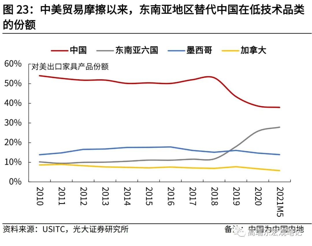 低技术产品(食品、农产品、纺服),始终没有大规模进入到关税排除清单中,中国对美国出口的份额,也被东南亚国家持续替代。低技术品类始终没有大规模进入到关税排除清单,直到2020年二季度,疫情冲击下,美国对于“宅经济”品类的需求快速增多,家具造纸相关品类才开始进入排除清单。低技术品类商品,即使在疫情期间,对美出口的份额也在持续被东南亚国家代替。因此,美国对于中国的低技术品类依赖度较低,相关品类也难以优先得到关税减免。