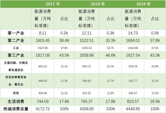 批发和零售贸易业、餐饮业的节能效应更为显著,2019年该项能源消费量为452.77万吨标准煤,为过去三年最低,占比也降至了10.2%。