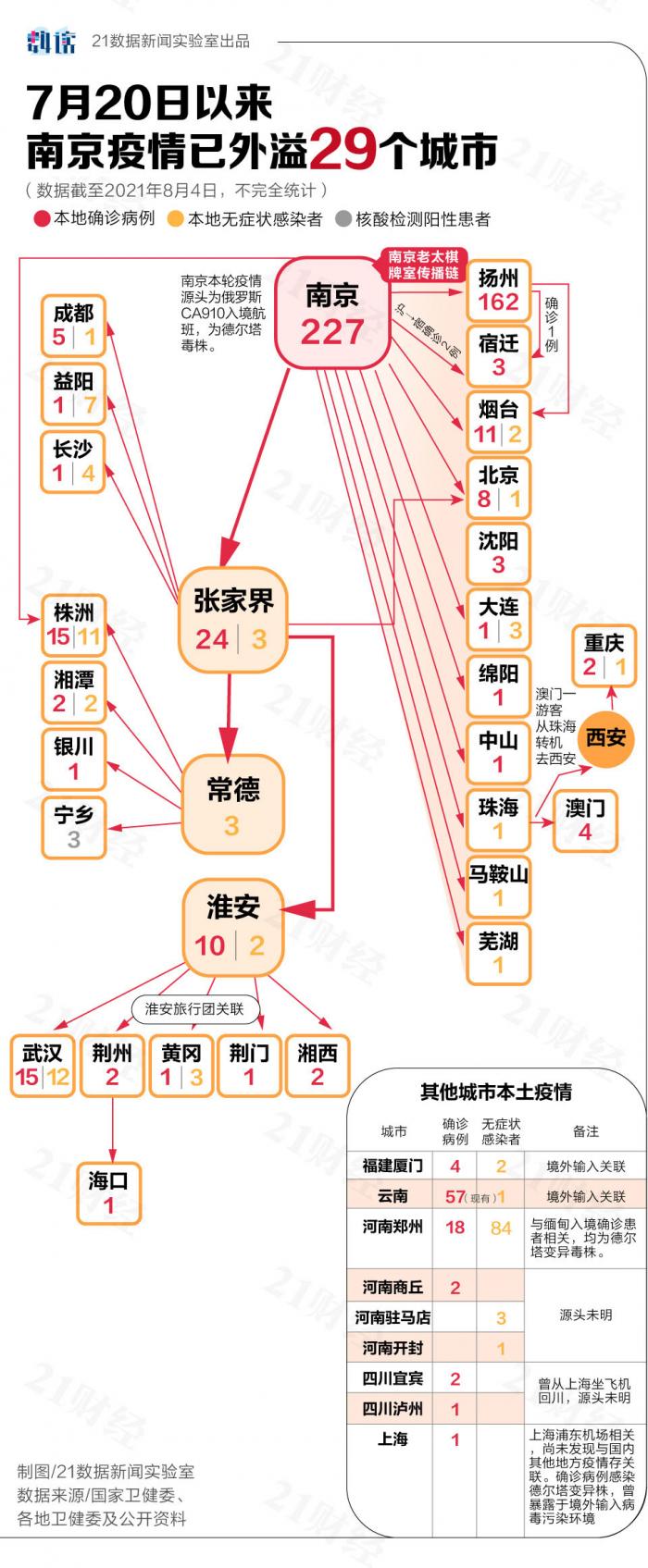 7月20日南京禄口机场报告9例确诊病例、8例无症状感染者。截至8月4日24时,南京市内累计报告本土确诊病例227例。据不完全统计,目前南京疫情已外溢全国29个城市,除南京以外,关联的确诊病例达270多例,无症状感染者约60例。