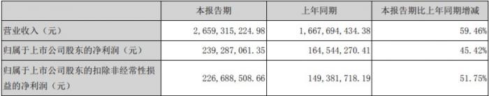 报告显示,今年1-6月华帝营收为26.59亿元,同比增长59.46%;归属于上市公司股东净利润为2.39亿元,同比增长45.42%;归属于上市公司股东的扣除非经常性损益的净利润为2.27亿元,同比增长51.75%。