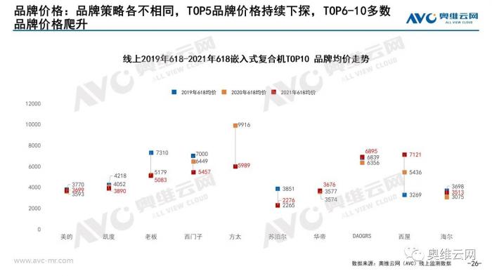 此外,线上占比越来越大也是厨卫均价下滑的原因之一。以嵌入式复合机均价为例,据奥维云网(AVC)统计,在2019、2020和2021年三年“618大促”中,嵌入式复合机TOP5品牌的均价持续下探。其中,老板均价从2019年的7310元下降到5083元,而华帝均价相对稳定,波动幅度保持在百元左右,方太均价降幅最大,从9916元下降到5989元。