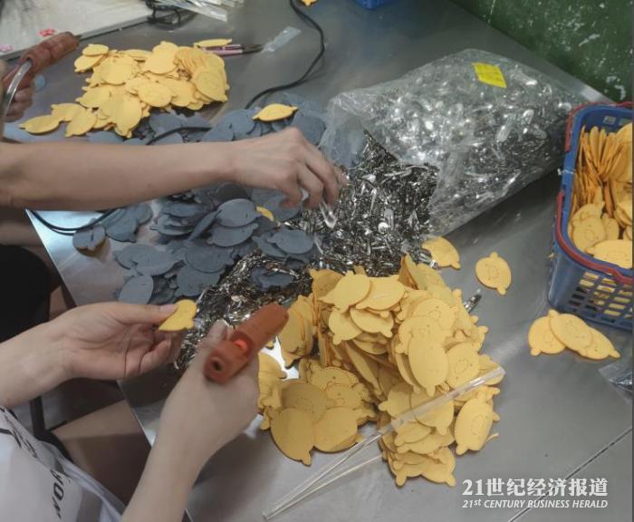 为了应对激增的订单,卢清的工厂迅速调整了产线的排产,将其他款式的工人和生产线调往这条产线,“我们当天晚上就赶紧排班生产,现在有30多个人在做小黄鸭,每人每天能生产1300个,每天总产量4万个左右,仍然赶不上庞大的订单量,所以还需要加班。”