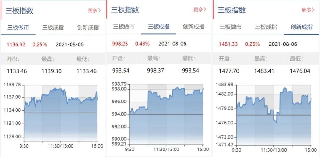 截至8月6日收盘,三板做市报1136.32点,上涨0.25%;三板成指报998.25点,上涨0.43%;三板创新报1481.33点,上涨0.25%。