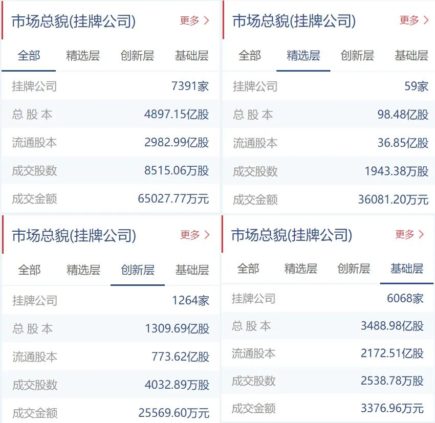 新三板挂牌公司总计7391家(精选层58家,创新层1264家,基础层6068家),总股本4897.15亿股,流通股本2982.99亿股。