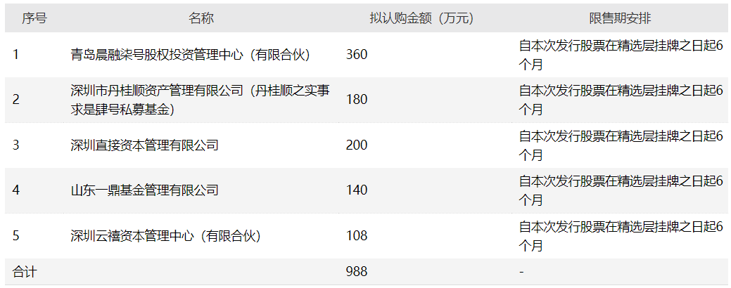 本次公开发行成功引入5名战略投资者,拟认购金额合计988万元。