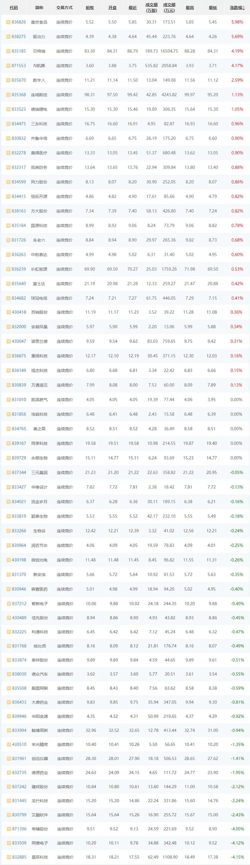 8月6日,精选层涨跌互现,26家企业上涨,5家平盘,28家下跌。其中,盖世食品(836826)涨幅居首,上涨5.98%;其次,驱动力(838275)上涨5.69%;星辰科技(832885)跌幅居首,下跌4.15%;同惠电子(833509)居次下跌4.12%;凯添燃气(831010)、浩森科技(831856)平盘。