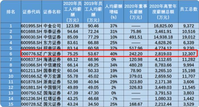 此外,多发奖金留住员工也是广发投行恢复重建的措施之一。根据今年年初媒体统计的一份券商从业人员人均薪酬数据,尽管中金公司的人均薪酬行业排名第一,但2019-2020年的人均薪酬增幅来说,排名第一的是广发证券,涨薪幅度40%。