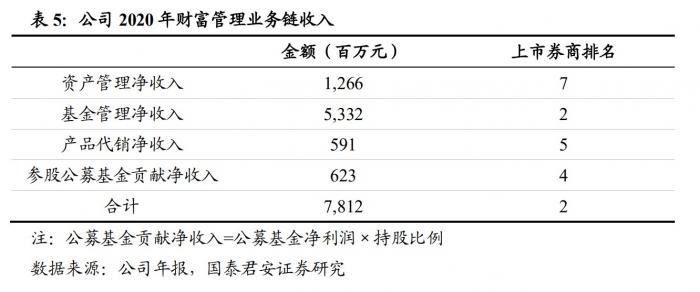 国泰君安将广发证券的资管与财富管理业务统归为“财富管理业务链”来计算。国泰君安称,2020年广发证券财富管理业务链的收入同比增长74.2%,快于上市券商整体42.9%的水平。2020年,广发证券财富管理业务链收入78.1亿元,在上市券商中排名第二;占公司调整后营收比重为28.5%,在上市券商中排名第三。(财富管理业务链=资管净收入+基金管理经手+产品代销净收入+参股公募基金贡献净收入)