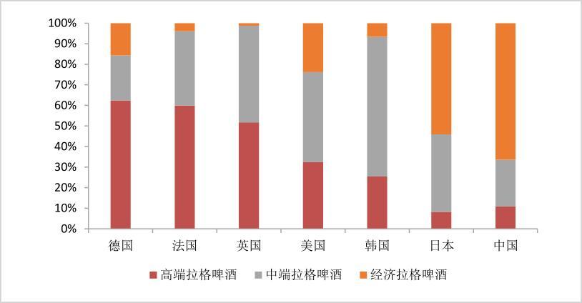 2019年,国内市场中高端拉格的占比只有11%,同期欧、美、日、韩的平均占比为40%,德、法、英等欧洲国家的这一数据更是接近60%。目前全球啤酒吨价的均值约为6325元,日本和美国则分别在10000元和8000元左右,国内主要啤酒企业的吨酒价集中在3000-4000元的区间内。