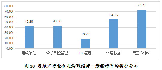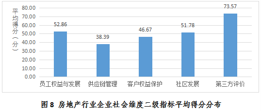 在社会维度的二级指标得分中,第三方评价为最高均分73.57分,其次为员工权益与发展52.86分、社区发展51.78分,得分较低的为客户权益保护46.67分,供应链管理平均得分最低,仅为38.39分(见图8)。可以看出,房地产行业上市公司立足自身行业优势,重视履行企业对于社会、利益相关方的责任,营造了良好的外部发展环境。