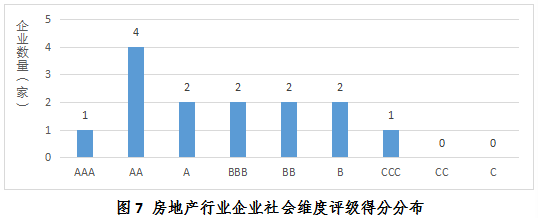 中国上市公司ESG评价的社会维度主要考察企业在员工权益和发展、供应链管理、客户权益保护、社区发展方面的信息披露情况,并以体现企业社会风险管理能力的社会领域负面舆情、企业员工伤亡作为负向指标,以社会领域的第三方正面评价作为加分项。2020年社会维度的评级结果为BBB级,评级分布表现最好,其中,评级最高的1家为AAA级,为新城控股集团股份有限公司,AA级4家、A级2家、BBB级2家、BB级2家、B级2家、CCC级1家。可以发现,房地产行业上市公司普遍注重企业对社会的积极贡献与发展。