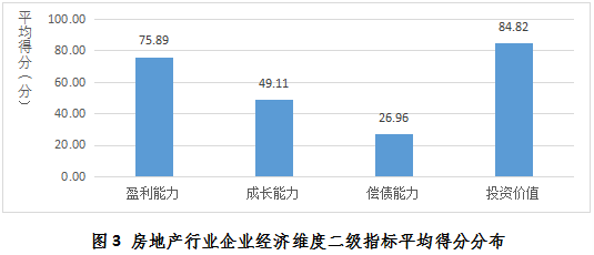 在经济维度二级指标中,盈利能力平均得分75.89分,成长能力平均得分为49.11,投资价值平均得分84.82分,最高得分为100分,最低得分为25分。这表明,房地产行业上市公司投资价值整体表现良好,但差异较大。偿债能力平均得分为最低,仅为26.96分。这表明,房地产行业仍需重视企业财务运转的可持续性,更加谨慎的投资,避免资金承压;同时应积极拓宽投融资渠道,缓解偿债资金压力;通过优化投资决策,降低企业经营与财务风险,促进企业改善经营管理,提高长期经济效益。