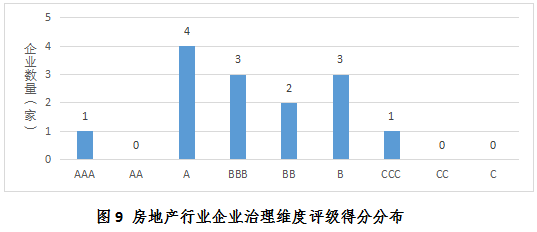 中国上市公司ESG评价的公司治理维度主要考察企业在管治层面的组织治理、合规风险管理、ESG管理、信息披露,并新增反映企业公司治理层面的负面案例或持续性影响事件的负面舆情、贪污腐败事件作为负向指标,以企业获得的正面第三方评价作为加分项。2020年治理维度评级结果为BBB级,其中,评级最高的1家为AAA级,为万科企业股份有限公司,A级4家、BBB级3家、BB级2家、B级3家、CCC级1家,整体上较上一年度的评级水平有明显提升。