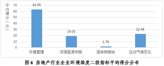 在环境维度的二级指标下,环境管理平均得分为62.95分,应对气候变化平均得分为22.48分,资源能源利用平均得分为19.03分,废弃物排放管理为1.79分(见图6)。这表明,在能源短缺、环境恶化等压力日益凸显的今天,节能与健康要求逐渐提高,绿色开发理念逐渐成为房地产开发的新要求。房地产行业顺应绿色发展理念与国际趋势,较为关注企业环境管理、资源能源利用和应对气候变化等核心议题。而废弃物排放管理得分较低则是企业重视程度不够、缺乏系统的排放物管理机制、统计报送程序及信息披露机制等多方面原因造成的。此外,在环境维度的二级指标中新增环境负面事件指标为负向指标,房地产行业环境负面事件平均得分为-14.29分,最低为-75分,主要是受到在评价年度内监管部门的多次通报,因而企业应积极加强环境污染防范,增强企业环境风险的管控能力。