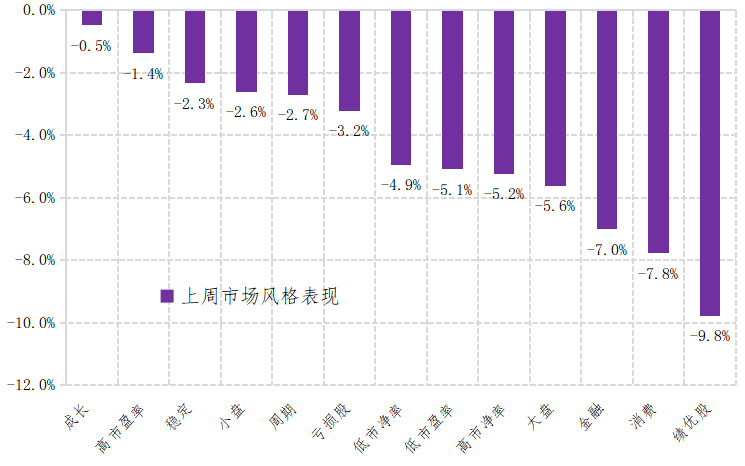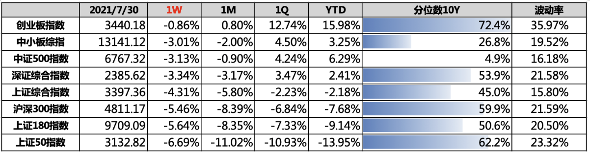 上周,宽基指数受政策扰动出现普跌,受利率继续下行、创业50和上证50相对景气度影响,消费和金融领跌,部分资金从消费等大盘蓝筹流出进入景气度较高的科技板块。上证综合指数收盘于3397.36点,全周下跌4.31%;创业板收盘于3440.18点,全周下跌0.86%;沪深300指数收盘于4811.17点,全周下跌5.5%。上周,受教育行业监管严格程度超预期影响,A股出现大幅波动,消费金融领跌。展望后市,A股指数已处在相对超跌位置,受基本面因素支撑,股市继续下行风险和幅度基本可控。