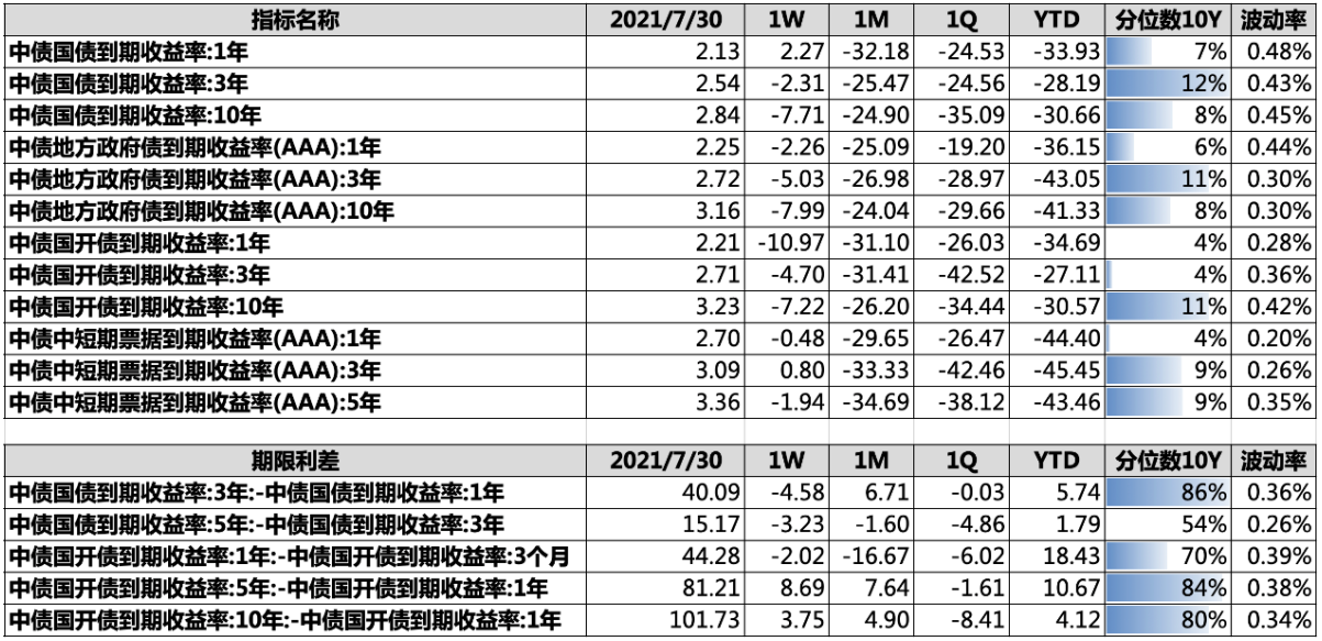 上周,无风险收益率曲线整体下移,短端下移明显。1年期国开债收益率下行10.97BP至2.21%,10年期国开债收益率下行7.22BP至3.23%。国开债10年和1年期期限利差单周上行3.75BP至101.73BP,5年和1年期期限利差单周上行8.69BP至81.21BP,从历史10年估值分位数来看,10年和5年期分位数处在80分位数以上。上周,央行维稳跨月流动性,在流动性宽松背景下,利率债短期限收益率下行较多。展望后市,经济基本面环比回落,通胀失控风险逐渐消除,中长期利率债的中枢水平或进一步下移,但是由于市场短期已经计入了较多乐观情绪,短期内快速下行的动能在弱化。