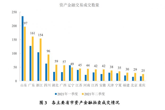 分区域来看,根据2021年第二季度线上平台资产金融拍卖交易情况,在交易总量上,资产金融拍卖的市场格局没有太大变化,山东省、广东省、浙江省的交易量排名全国前三位。