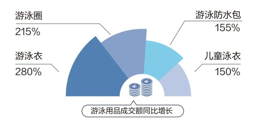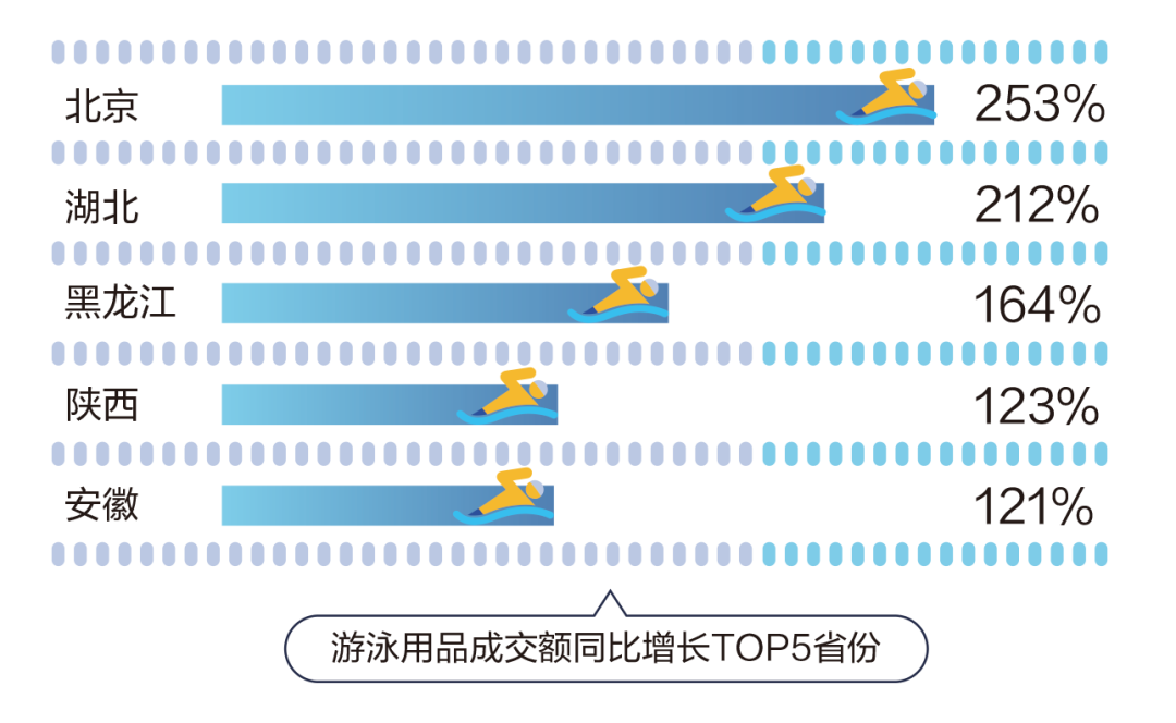 游泳用品成交额同比增长TOP5省份分别是北京、湖北、黑龙江、陕西和安徽,不知道你是否是其中一员呢?
