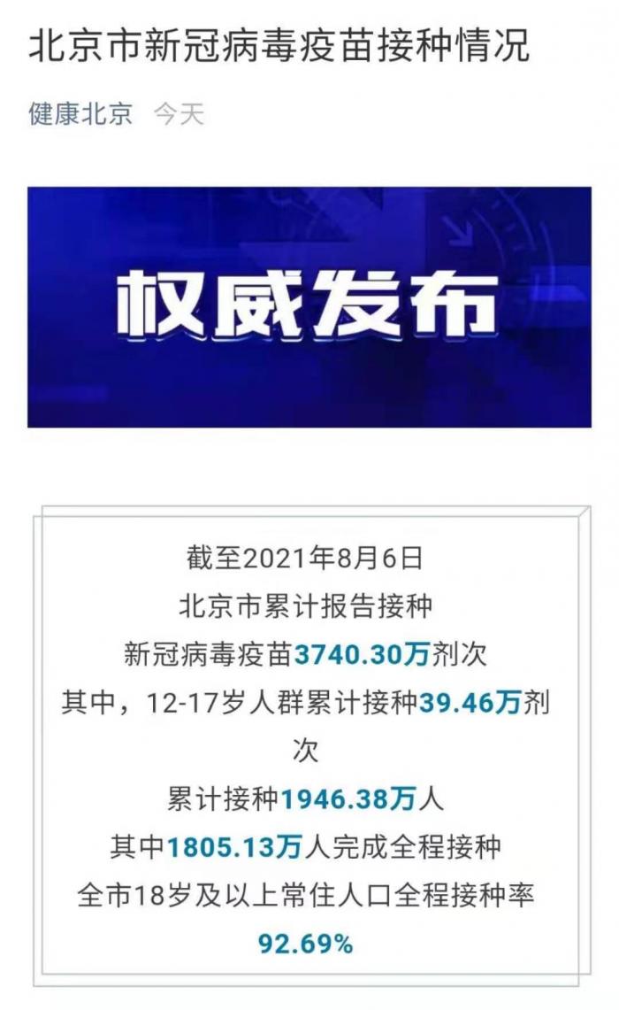 据“健康北京”微信公众号消息,截至2021年8月6日,北京市累计报告接种新冠病毒疫苗3740.30万剂次。