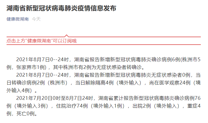 2021年8月7日0--24时,湖南省报告新增新型冠状病毒肺炎无症状感染者0例,当日转确诊病例2例(株洲市),当日解除隔离4例(境外输入),尚在医学观察24例(境外输入4例)。
