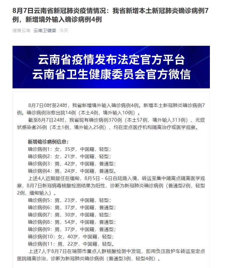 据“云南卫健委”官方微信公众号消息,8月7日0时至24时,云南省新增境外输入确诊病例4例。新增本土新冠肺炎确诊病例7例。确诊病例治愈出院14例(本土4例,境外输入10例)。