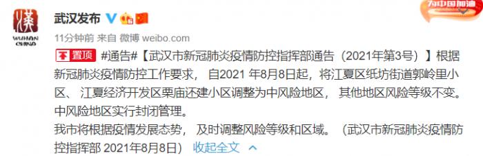 武汉市将根据疫情发展态势, 及时调整风险等级和区域。(武汉市新冠肺炎疫情防控指挥部 2021年8月8日)
