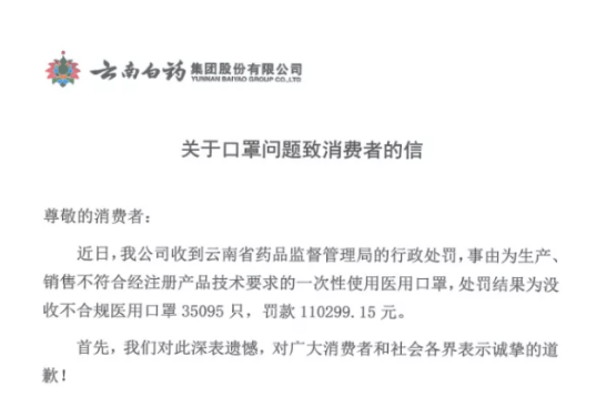云南白药(000538)近日上了热搜。因销售劣质口罩,该公司被监管部门处罚近11万。今日早间,云南白药就口罩问题公开发布了致歉信。