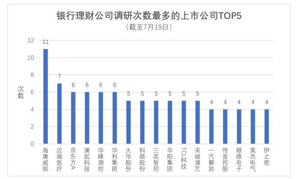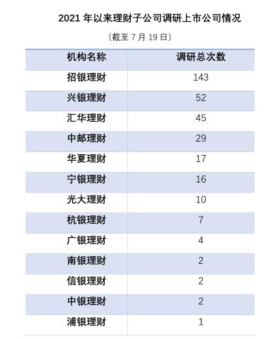 今年以来(截至2021年7月19日),13家银行理财公司合计调研上市公司330次,远超去年全年146次调研。