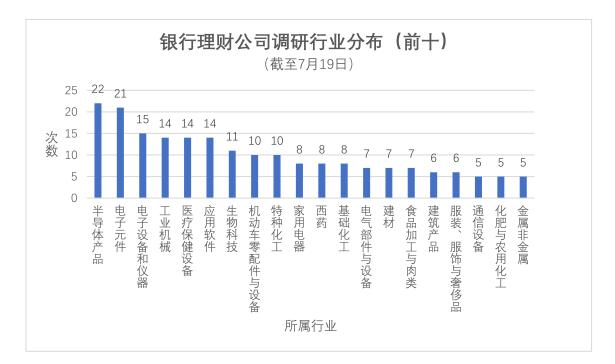从行业分布上看,理财公司调研标的丰富,半导体产品、电子元件、电子设备和仪器、工业机械、医疗保健设备、应用软件、生物科技等行业被理财公司所青睐。同时机动车零配件、特种化工、家用电器、西药、基础化工等行业也是理财公司关注的重点。