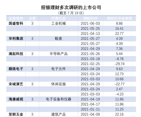 招银理财对多家上市公司进行了频繁调研。例如,招银理财各对国盛智科、华利集团、澜起科技、顺络电子、宋城演艺、海康威视、坚朗五金、晨化股份分别进行了3次调研;各对中科创达、伊之密、立高食品、四方光电、传音控股、国光股份、山东玻纤、珠江啤酒、稳健医疗、伟星新材、一汽解放、容百科技、帅丰电器分别进行了2次调研。