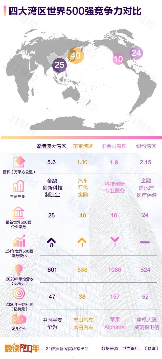 21数据新闻实验室梳理发现,在最近发布的2021财富世界500强企业名单中,共有99家企业总部坐落全球四大湾区,数量创历年新高。粤港澳大湾区已与美国的旧金山湾区、纽约湾区以及日本的东京湾区并驾齐驱,成为全球经济新的增长极。