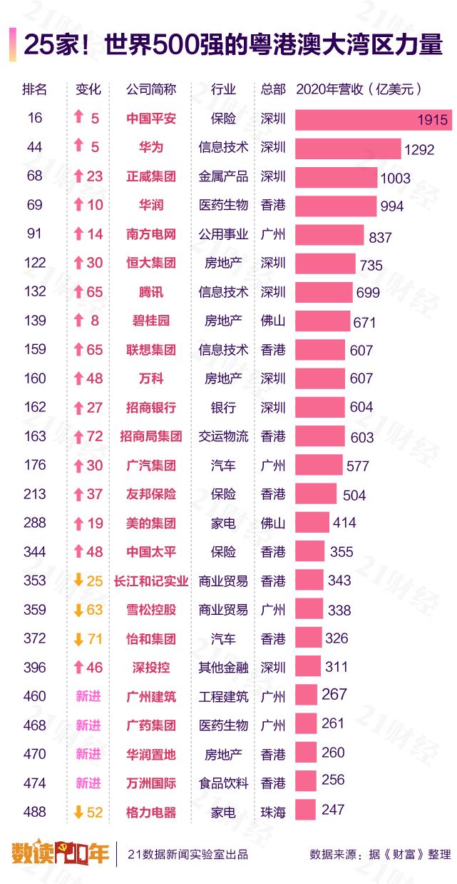 2021年,粤港澳大湾区的世界500强企业达到25家,新增的4家分别为来自广州的广州建筑、广药集团,以及来自香港的华润置地、万洲国际。