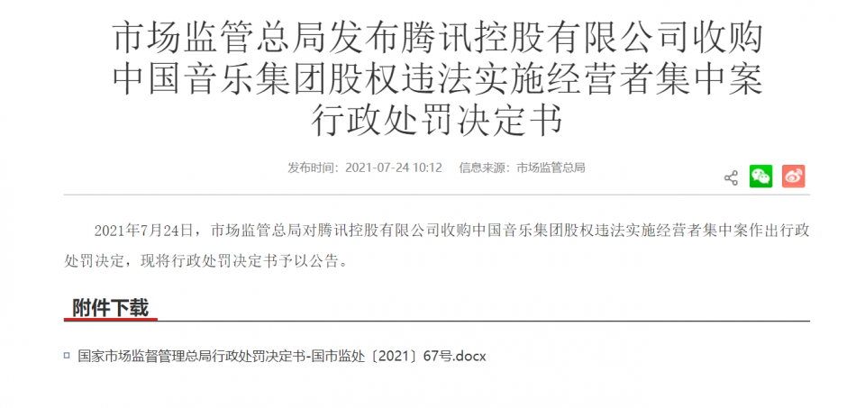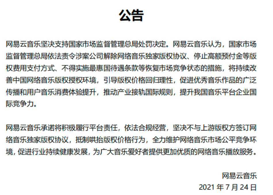 值得注意的是,在网易云上市前夕,7月24日,国家市场监管总局发布公告称:责令腾讯及关联公司采取三十日内解除独家音乐版权、停止高额预付金等版权费用支付方式、无正当理由不得要求上游版权方给予其优于竞争对手的条件等恢复市场竞争状态的措施。