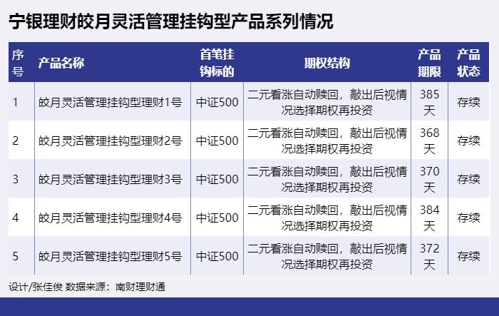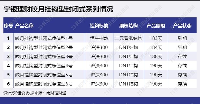 目前,宁银理财发行了5只“皎月”全球配置挂钩型理财产品,其中封闭式产品有2只,定期开放式产品有3只。无论是封闭式还是开放式,产品单个投资周期均不小于一年,挂钩标的均为中信证券大类资产趋势2.0指数(GMAT2.WI),期权结构为牛市看涨价差。