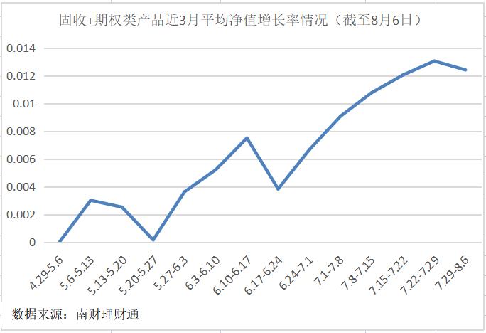 据南财理财通数据显示,理财子公司“固收+期权”类产品近3月平均净值增长率呈震荡走高态势。截至7月29日-8月6日该周,理财子公司“固收+期权”产品近3个月平均净值增长率较基期上涨1.2400%,近3个月平均波动率较基期上涨0.2150%。