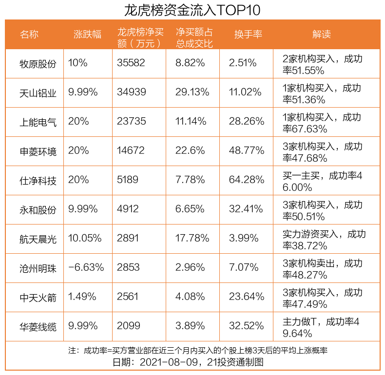 8月9日,沪指上涨1.05%,深证成指上涨0.77%,创业板指下跌0.98%。盘后龙虎榜数据显示,共有36只个股因当日异动登上龙虎榜,资金净流入最多的是牧原股份(002714.SZ),达3.56亿元。