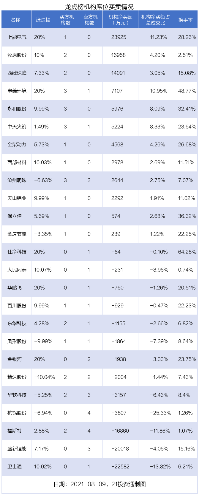 8月9日,25只个股龙虎榜出现了机构的身影,机构合计净买入1.12亿元。具体来看,机构净买入12股,净卖出13股。