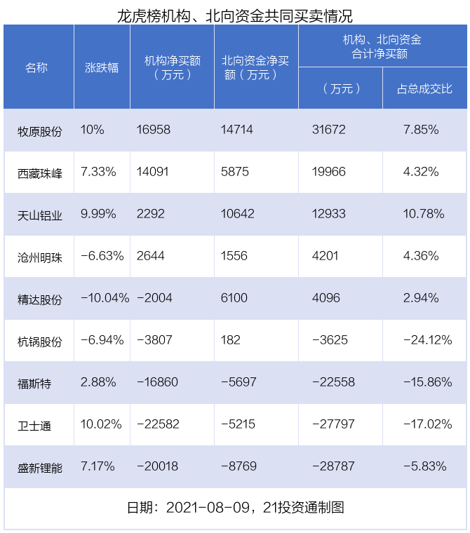 值得注意的是,机构和北向资金共同净买入了牧原股份、天山铝业、西藏珠峰、沧州明珠等4股;共同净卖出了卫士通、福斯特、盛新锂能等3股;在精达股份,杭锅股份上出现分歧,机构净卖出精达股份2004.34万元,北向资金净买入6100.29万元;机构净卖出杭锅股份3807.3万元,北向资金净买入182.18万元。