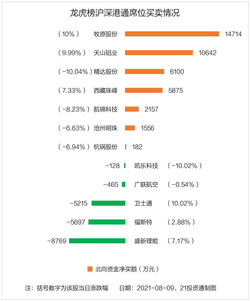 8月9日,北向资金参与龙虎榜中的个股共有12只,合计净买入2.1亿元。其中沪股通净买入2 股,净卖出2 股,合计净买入6150.26万元;深股通净买入5 股,净卖出3 股,合计净买入1.48亿元。